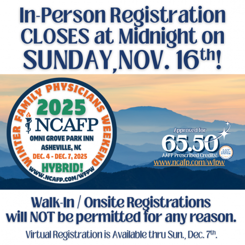 In-person attendees at the NCAFP Hybrid Winter Family Physicians Weekend can earn up to 66.50 AAFP Prescribed credits. In-person registration ends on Nov. 16!